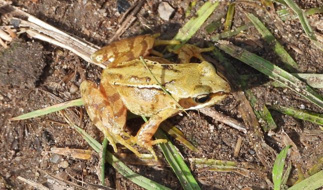 Identification Who hasn’t seen a Frog? They are typically shades of browny-yellow to browny-green in colour. The undersides are pale-whitish, flanks yellower and the upper surfaces exhibit darker markings from tan to brown to black. The hind feet are webbed and the strong hind legs feature dark banding. Males tend to be slightly smaller than females and can be identified by whitish swelling on the inner digits of the front feet. Common Frogs hibernate during winter, either at the bottom of ponds, breathing through their skin or under log piles, compost heaps and the like. During the rest of the year they tend to be land based. Males return to breeding sites during spring ahead of the females and it is thought they return to their natal ponds. Females lay up to 2000 eggs, frogspawn, with the young tadpoles emerging after around 14 days. Metamorphosis into adults takes around 10 to 15 weeks. Tadpoles are predated by a large range of aquatic creatures, including the newts above.