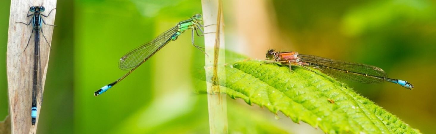 Identification - This species has been found to be common on all four beds since recording began in 1986. Similar looking to the Azure Damselfly but in general appears to have more blue than black colouration which is reversed in the Azure Damselfly. It also has a wider blue antehumeral stripe on the thorax than the Azure Damselfly and only one black line below this blue antehumeral stripe. Females can be blue coloured as the male or a dull green/grey colour and can be difficult to separate without attention to finer detail.