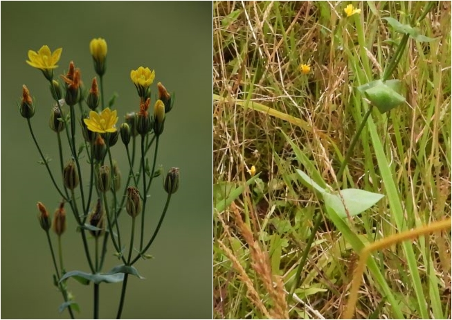 Identification: a short to medium tall annual, hairy, with unstalked lanceolate leaves, toothed and opposite. Flowers are rayless, button-like and a yellow-brown on usually solitary stalks, nodding and generally larger than Trifid Bur Marigold. July to October.