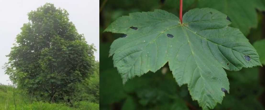 Identification: A tree to 20m, roughish grey bark, leaves bluntly 5-lobed, untoothed, smaller than sycamore and reddish when young. Flowers greenish in erect clusters in May, fruit with wings diverging at 180o not angled are usually downy.