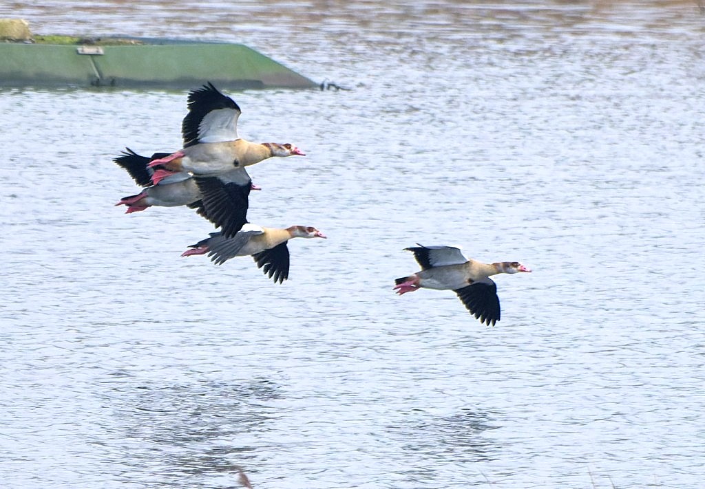 While most of our Saturday morning visitors were focussed on looking for the Penduline Tit on No.4 bed, we opted for a lazy morning in the Morgan Hide on No.3 bed. This turned out to be a good choice, as blue skies and sunshine, albeit with a cold breeze, triggered quite a bit of pre-breeding behaviour. A pair of Marsh Harriers were tentatively displaying throughout the morning and we are hoping for a breeding attempt on the bed this year, in addition to the well-established pair on another part of the Reserve. With around 500 wildfowl on the bed, it was no surprise when a hunting male Peregrine arrived, though the surprise of the morning came when four Egyptian Geese dropped in. Originally of African origin, they have established a feral breeding population in the UK, with around 1,800 pairs currently breeding, mainly in the south of England. They remain a very scarce visitor to the Reserve and so were nice to add to a growing year-list. Finally, a Great White Egret arrived and, as we were walking off the bed around 60 Redwings were feeding in the shelter belt, harbingers of the easterly movement which will take them back to the east coast and then on to their Fenno-Scandian breeding grounds as spring progresses. Photo of the Egyptian Geese. Cheers David Bowman (with Helen Wynn and Brian Baird)