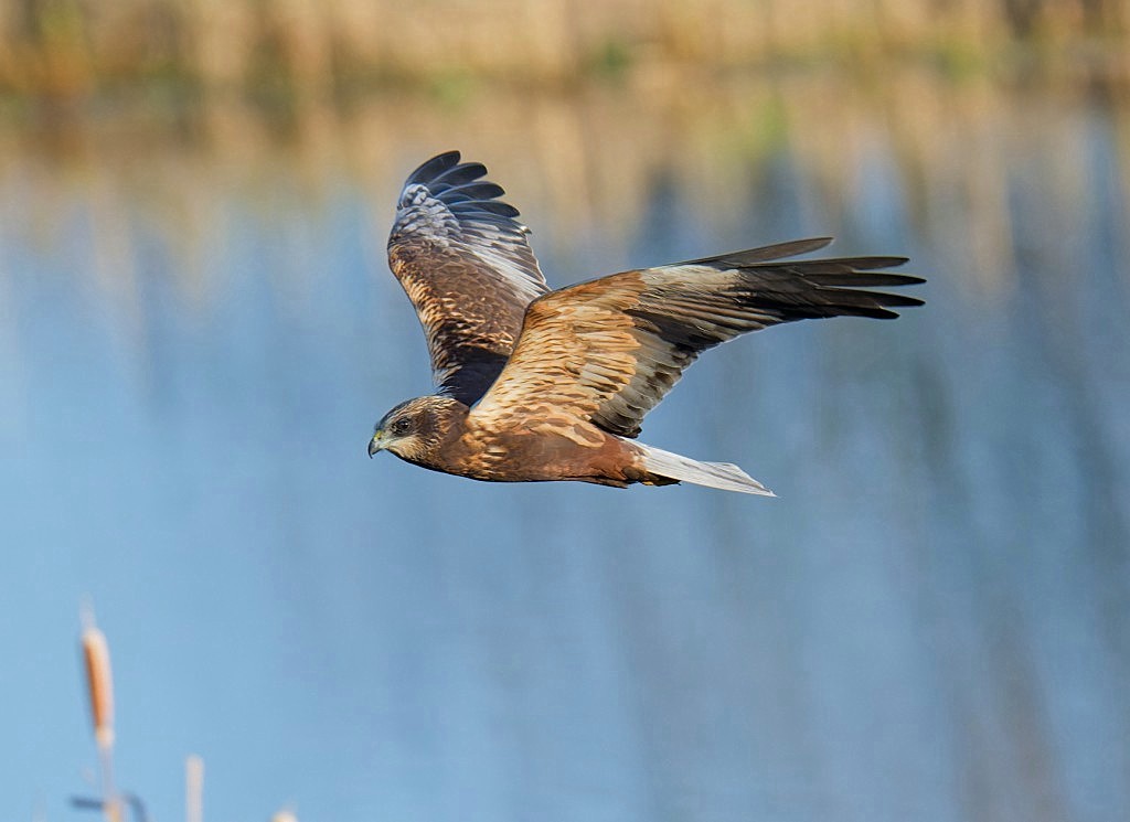 After so many wet and windy mornings recently it was good to walk onto No.4 bed this morning with clear skies and a fiery dawn. A Woodcock flushed from the track as I was walking on to check whether the small Starling roost which our warden, Eva Pyrah, had first noted a week or so ago, was still present. Looking out across the east cell of the wetland the presence of hunting Barn Owl, Sparrowhawk and Marsh Harrier in the vicinity of the roost site boded well, as such roosts inevitably attract the attention of a variety of aerial predators. Sure enough, as the sun rose an estimated 6,000 Starlings emerged with a rush and flew off to the south. Winter roosts in the UK are often swollen by the arrival of millions of birds from colder countries in north-east Europe. Back in 2015 No.3 bed held a roost which we estimated to hold around 500,000 birds - an unforgettable sight and you can see a video of that roost if you search my YouTube channel! With a bit of luck we might see a repeat of that, particularly if the continent experiences a harsh winter. Other sightings included around 1,000 Pink-footed Geese flying over plus small numbers of Redwing and Fieldfares drifting eastward. Photo of a male Marsh Harrier Cheers David Bowman